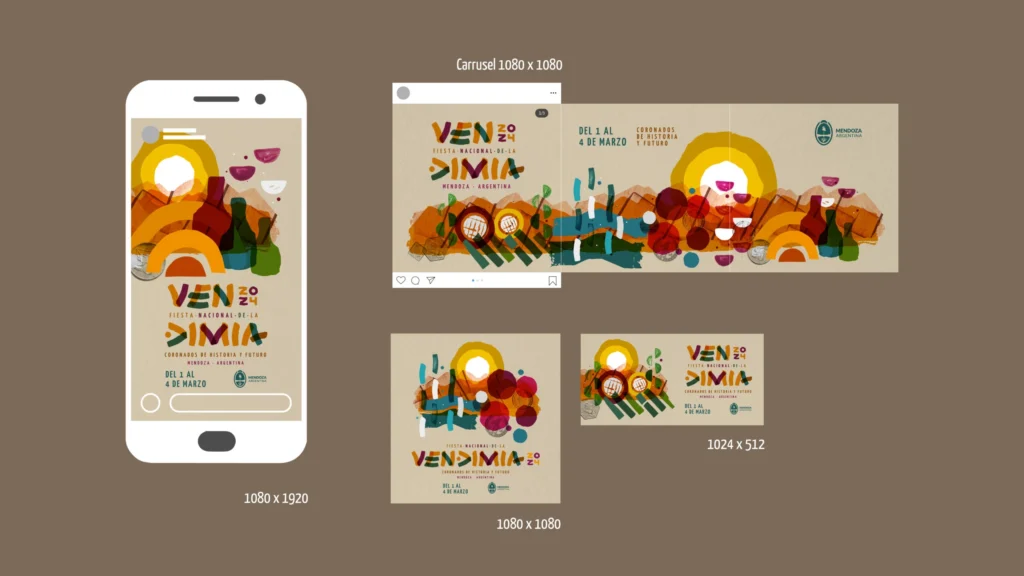 “Nuestro proceso comenzó con una etapa de abstracción. Identificamos los elementos transversales de la mendocinidad: la montaña, el sol, el agua y la jarilla. El concepto rector fue la línea del tiempo, conectando las raíces (pinturas rupestres) con la modernidad (la fiesta en el anfiteatro). Este enfoque nos permitió crear no solo un afiche, sino un sistema de comunicación integral
